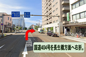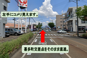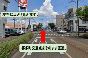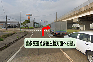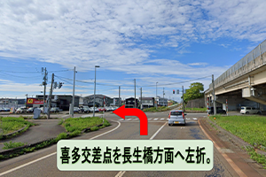 喜多交差点を長生橋方面へ左折し、しばらく直進します