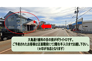 右手にポワイトGが見えるため、正面から入って頂くと当院駐車場がございます。