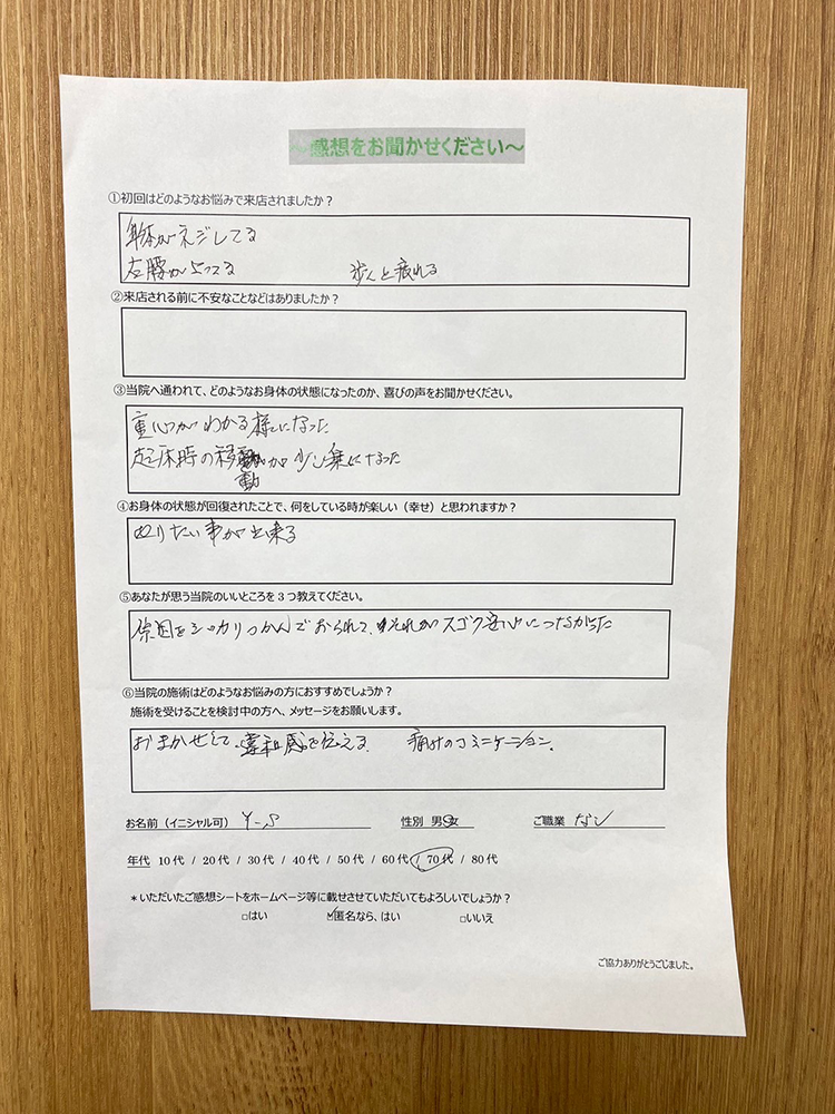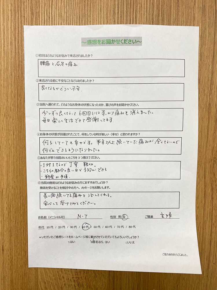 3回から4回程通って痺れが気にならずに生活ができるようになっていました。長時間同じ姿勢でいると腰が重くなる感じがありましたが、6回目にしてすっかり痛みが消えました。おかげさまで毎日楽しく生活ができて感謝しています。半年以上続いていた足の痛みが全くないのでなんでもできるようになりました。