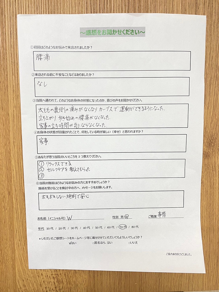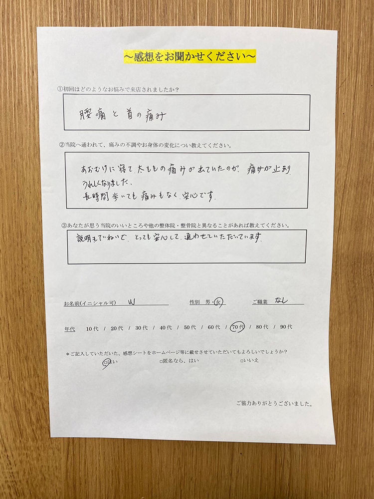 施術後は体全体が軽くなり、前まであった腰の痛みがなくなりました。腕と足の痺れも気にならない程軽くなりました。歩くのが苦手でしたが、お陰様で自宅からお店まで歩いて通うことができるようにもなりました。まだ通っている最中なので、これからどんどん痛みがなくなっていくことを想像すると楽しみです。