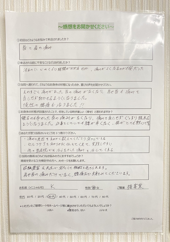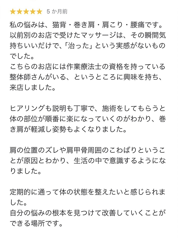 ヒアリングも説明も丁寧で、施術をしてもらうと体の部位が順番に楽になっていくのがわかり、巻き肩が軽減し姿勢もよくなりました。