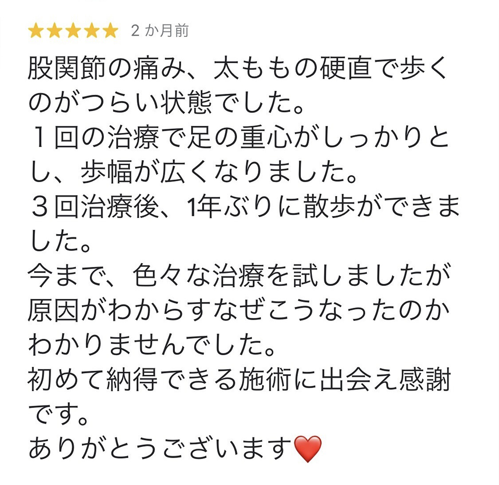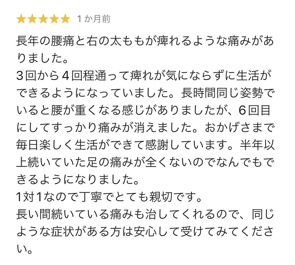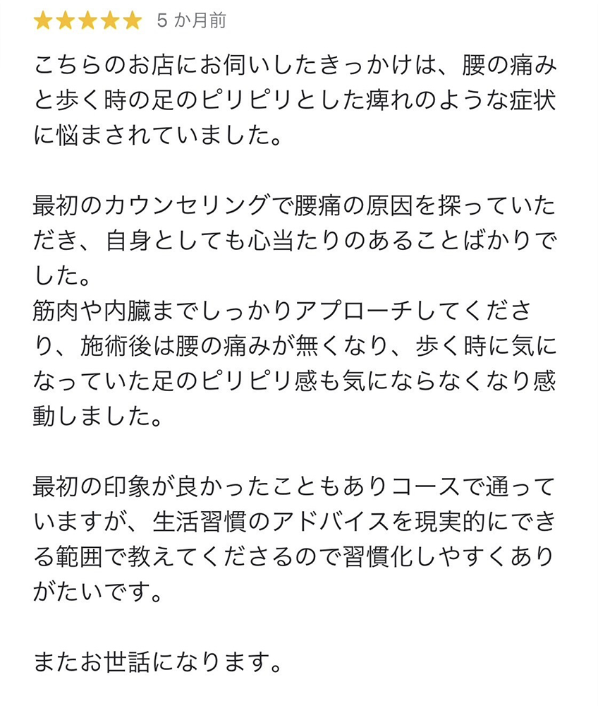 筋肉や内臓までしっかりアプローチしてくださり、施術後は腰の痛みが無くなり、歩く時に気になっていた足のピリピリ感も気にならなくなり感動しました。