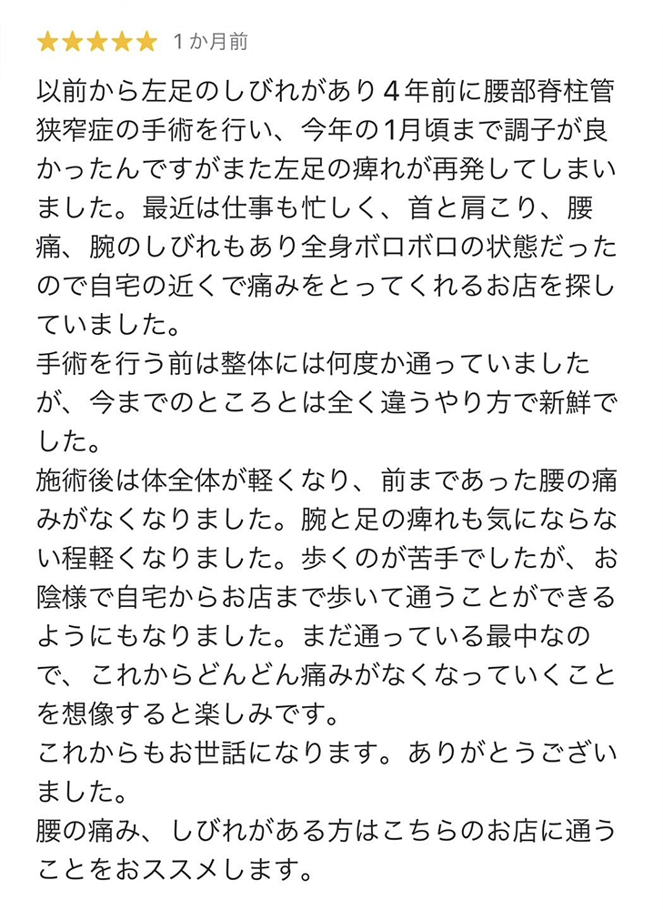 以前から左足のしびれがあり4年前に腰部脊柱管狭窄症の手術を行い、今年の1月頃まで調子が良かったんですがまた左足の痺れが再発してしまいました。最近は仕事も忙しく、首と肩こり、腰痛、腕のしびれもあり全身ボロボロの状態だったので自宅の近くで痛みをとってくれるお店を探していました。