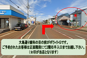 左手にポワイトGが見えるため、正面から入って頂くと当院駐車場がございます。