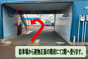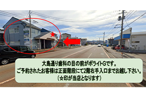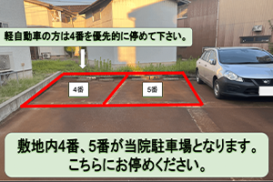 右手にポワイトGが見えるため、正面から入って頂くと当院駐車場がございます。
